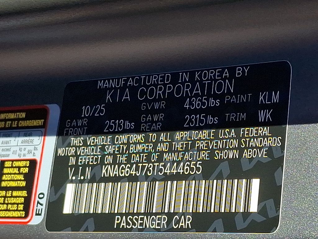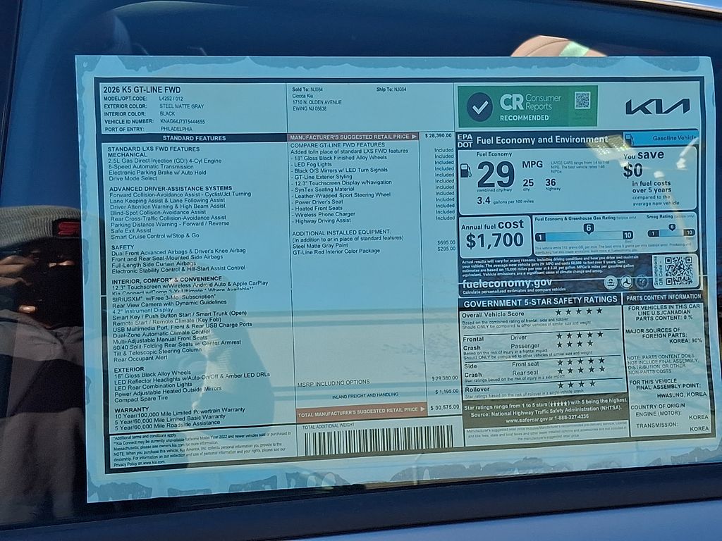 4-Wheel Disc Brakes, 6 Speakers, ABS brakes, Air Conditioning, Alloy wheels, AM/FM radio: SiriusXM, Auto High-beam Headlights, Automatic temperature control, Brake assist, Bumpers: body-color, Delay-off headlights, Driver door bin, Driver vanity mirror, Dual front impact airbags, Dual front side impact airbags, Electronic Stability Control, Emergency communication system: Kia Connect (includes 1 year free trial), Four wheel independent suspension, Front anti-roll bar, Front Bucket Seats, Front Center Armrest, Front dual zone A/C, Front fog lights, Front reading lights, Fully automatic headlights, GT-Line Red Interior Package, Heated door mirrors, Heated Front Bucket Seats, Heated front seats, Illuminated entry, Knee airbag, Leather Shift Knob, Leather steering wheel, Low tire pressure warning, Navigation System, Occupant sensing airbag, Outside temperature display, Overhead airbag, Overhead console, Panic alarm, Passenger door bin, Passenger vanity mirror, Power door mirrors, Power driver seat, Power steering, Power windows, Radio data system, Radio: AM/FM Audio System, Rear anti-roll bar, Rear seat center armrest, Rear side impact airbag, Rear window defroster, Remote keyless entry, Security system, Speed control, Speed-sensing steering, Split folding rear seat, Sport steering wheel, Steering wheel mounted audio controls, SynTex Seat Trim, Tachometer, Telescoping steering wheel, Tilt steering wheel, Traction control, Trip computer, Turn signal indicator mirrors, Variably intermittent wipers, Wheels: 18" x 7.5J Gloss Black Machined Finish Alloy. Price includes: $1250 - KFA Dealer Choice Program: $1250 discount and 5.25% APR for 36 months. $30.08 per $1000 financed. Available to well qualified buyers who finance through Kia Finance America. 506. Exp. 05/04/2026